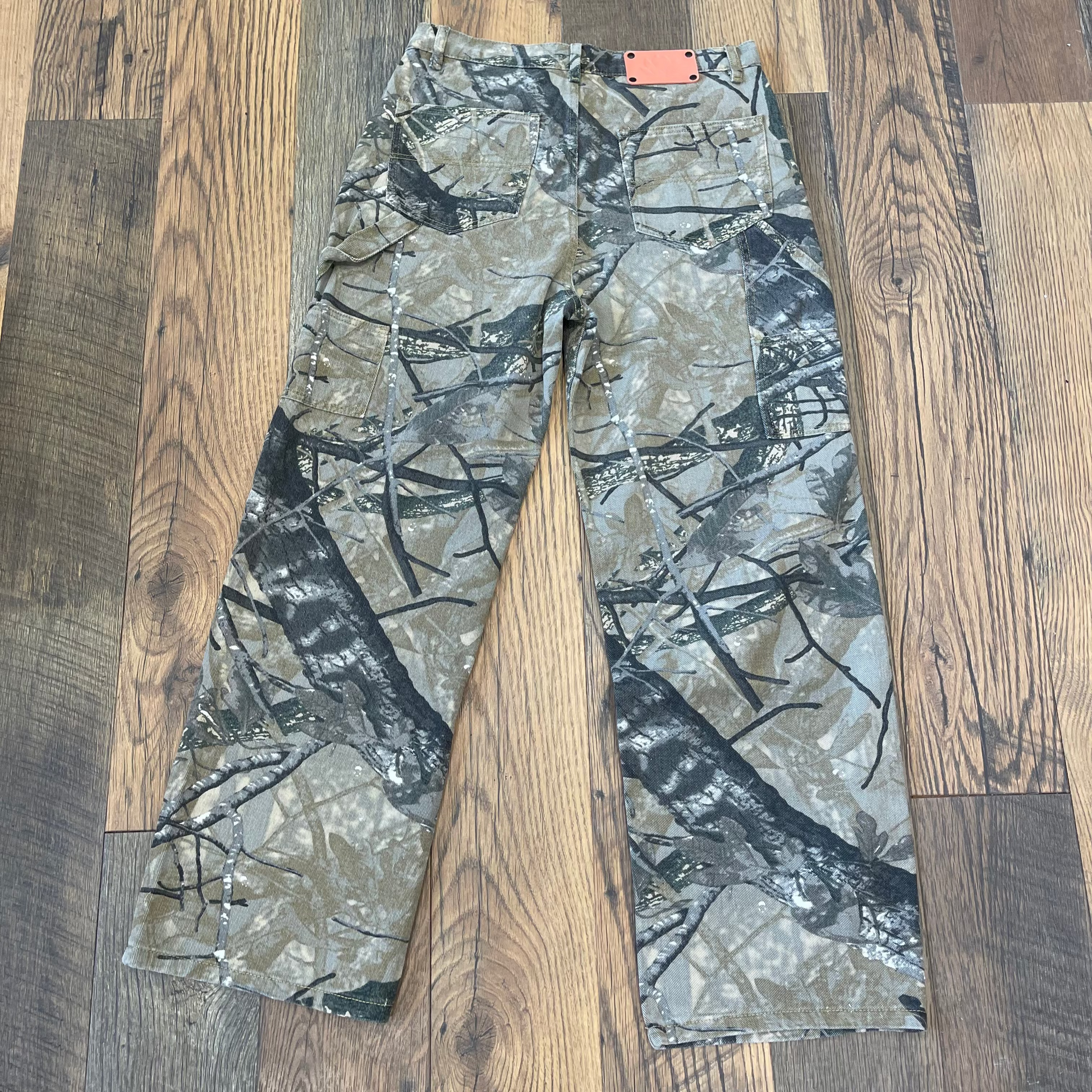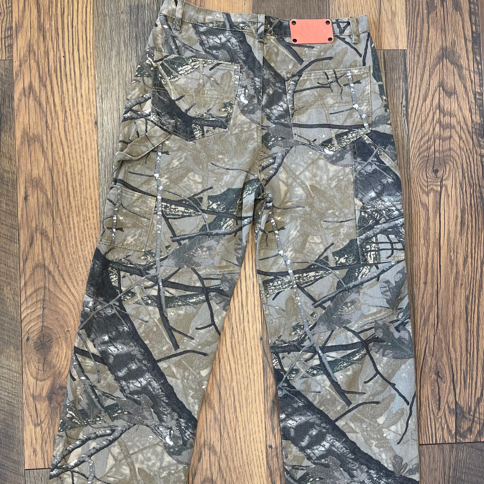 Our Camo Carpenter pant features a double-knee panel, a hunting camo print, pockets, and a baggy fit. Featuring an embossed Lotus Leather Pink Label made locally and riveted onto the jeans. Quantity is limited.