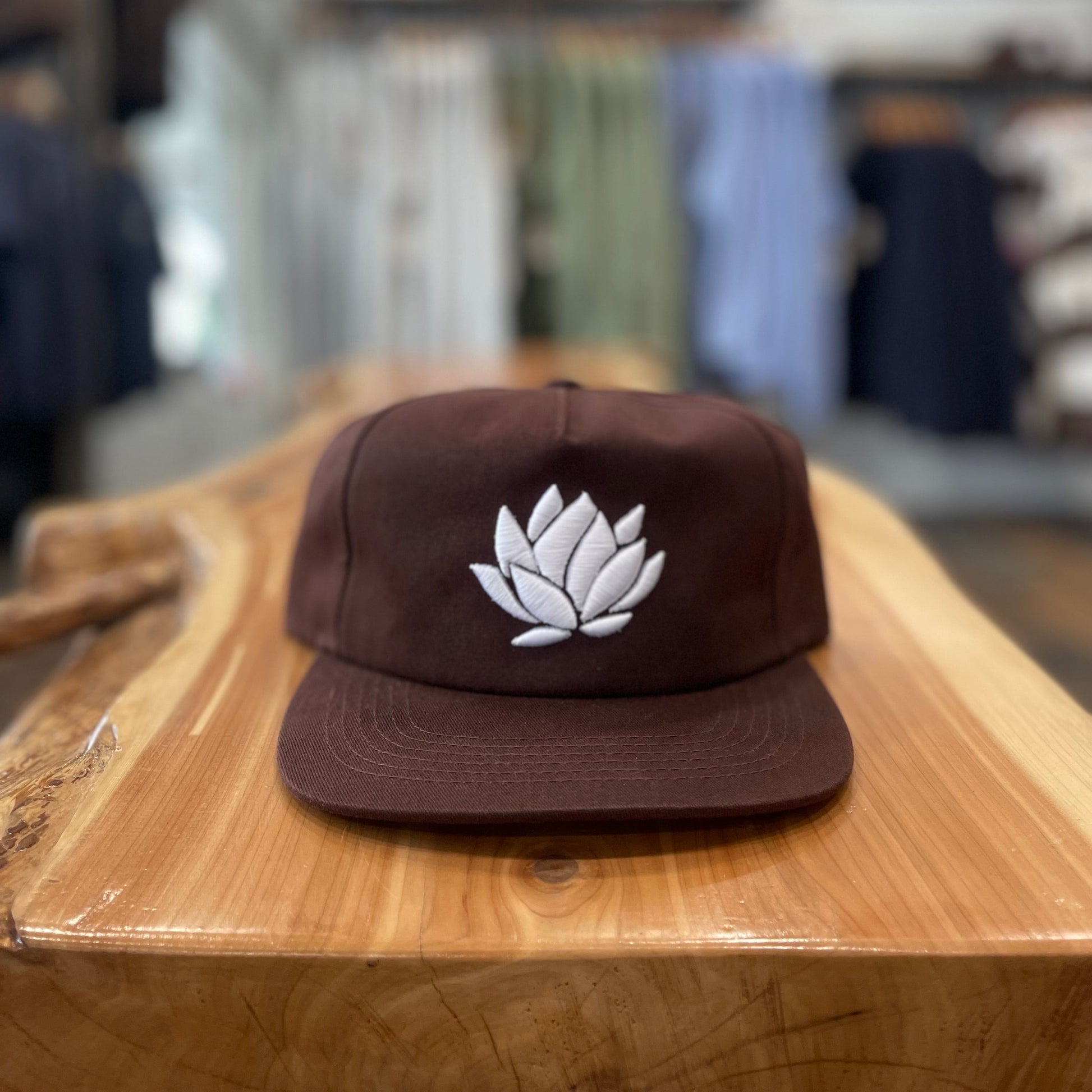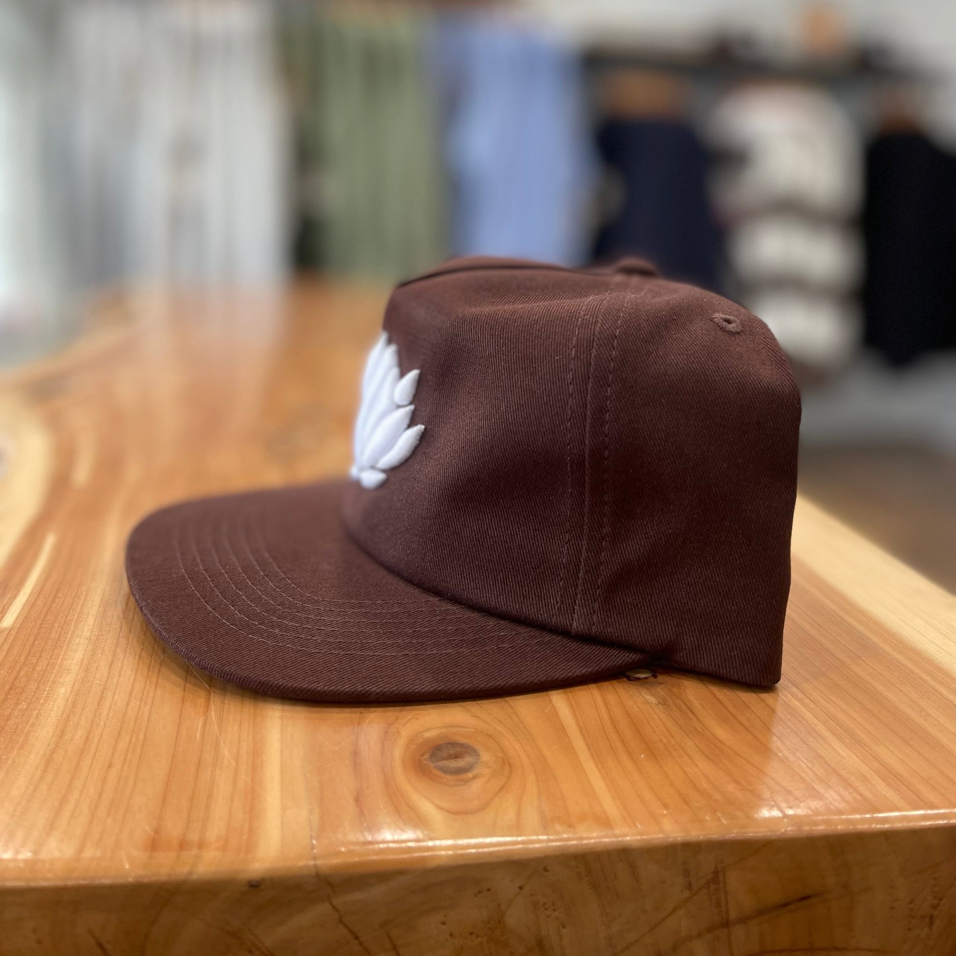 Introducing a new Surf Lotus 5-panel snapback featuring Oeko-Tex Standard 100 certified cotton fabric and a visor peak crafted from Scope Certified recycled materials. Universally sized for a comfortable fit, all Chocolate Brown with a White puff embroidered Lotus.