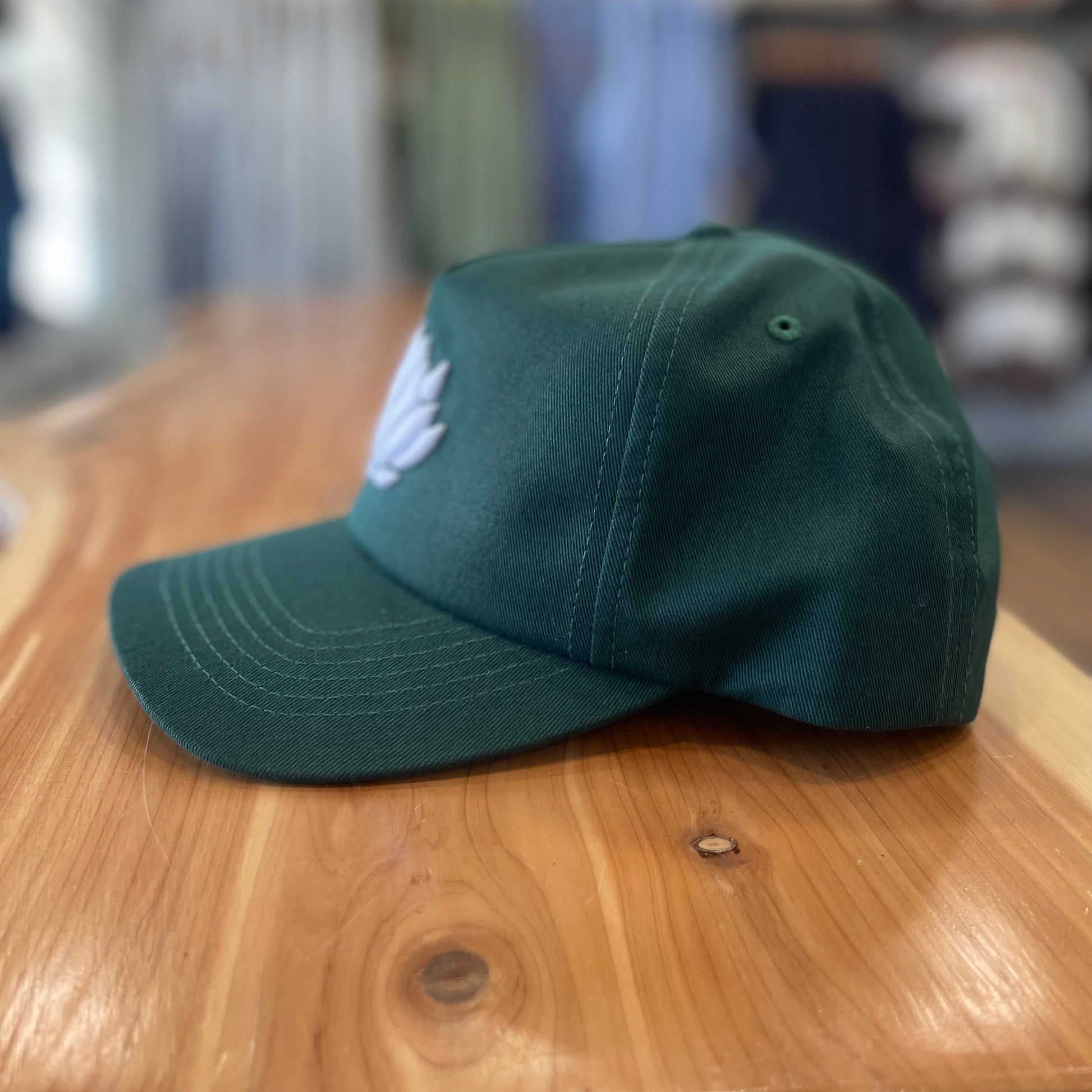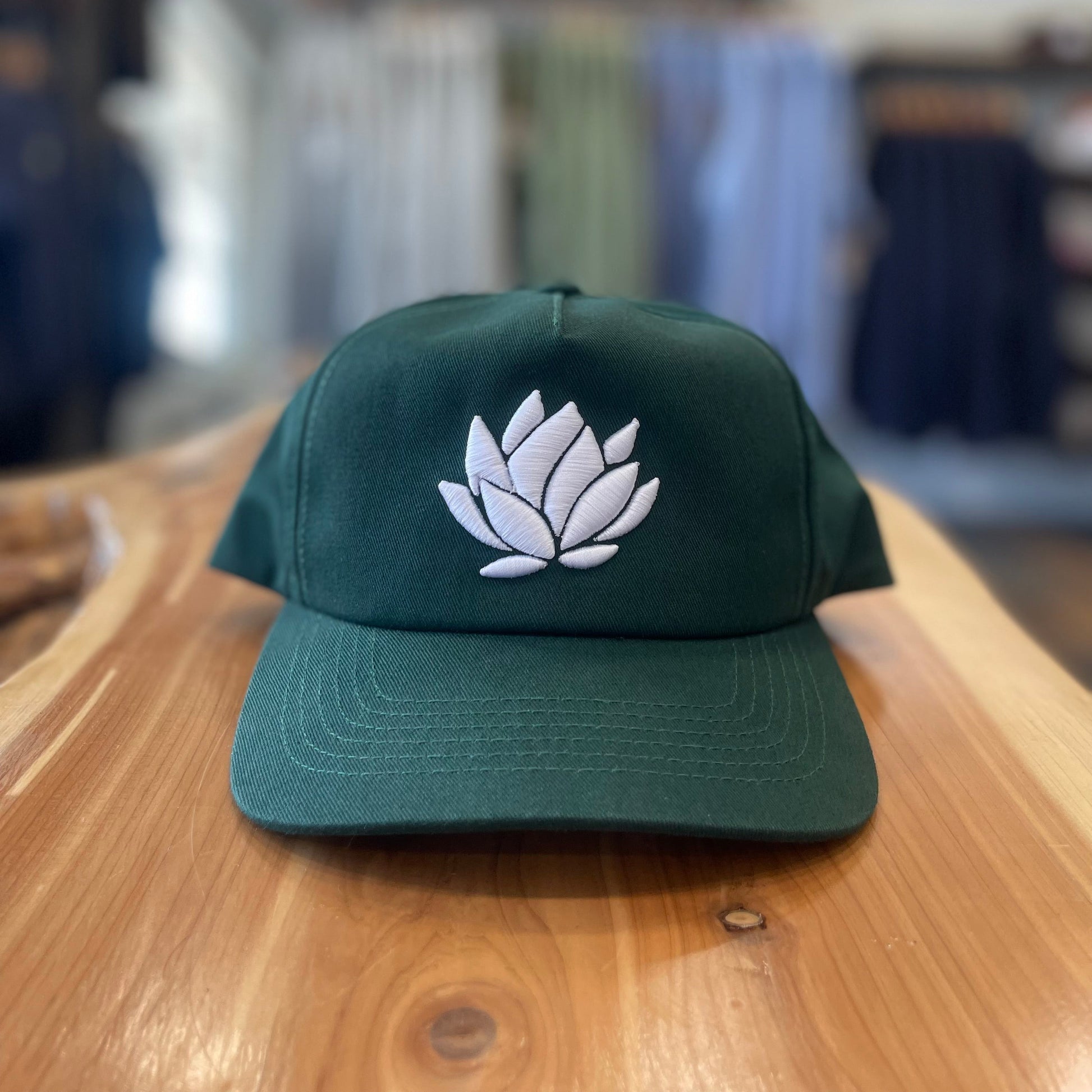 Introducing a new Surf Lotus 5-panel snapback featuring Oeko-Tex Standard 100 certified cotton fabric and a visor peak crafted from Scope Certified recycled materials. Universally sized for a comfortable fit, all Forest Green with a White puff embroidered Lotus.