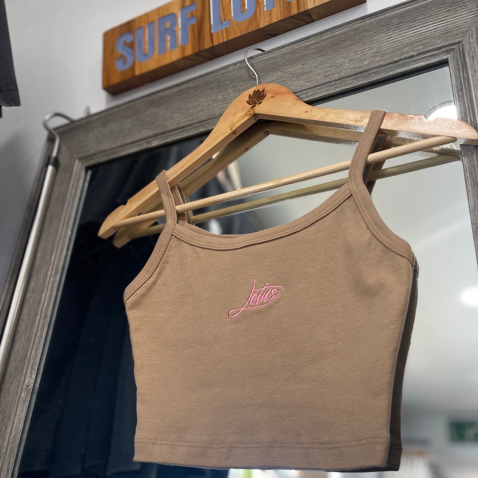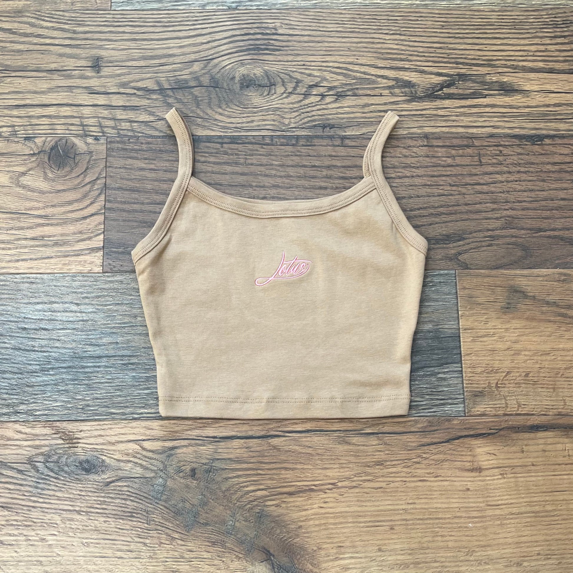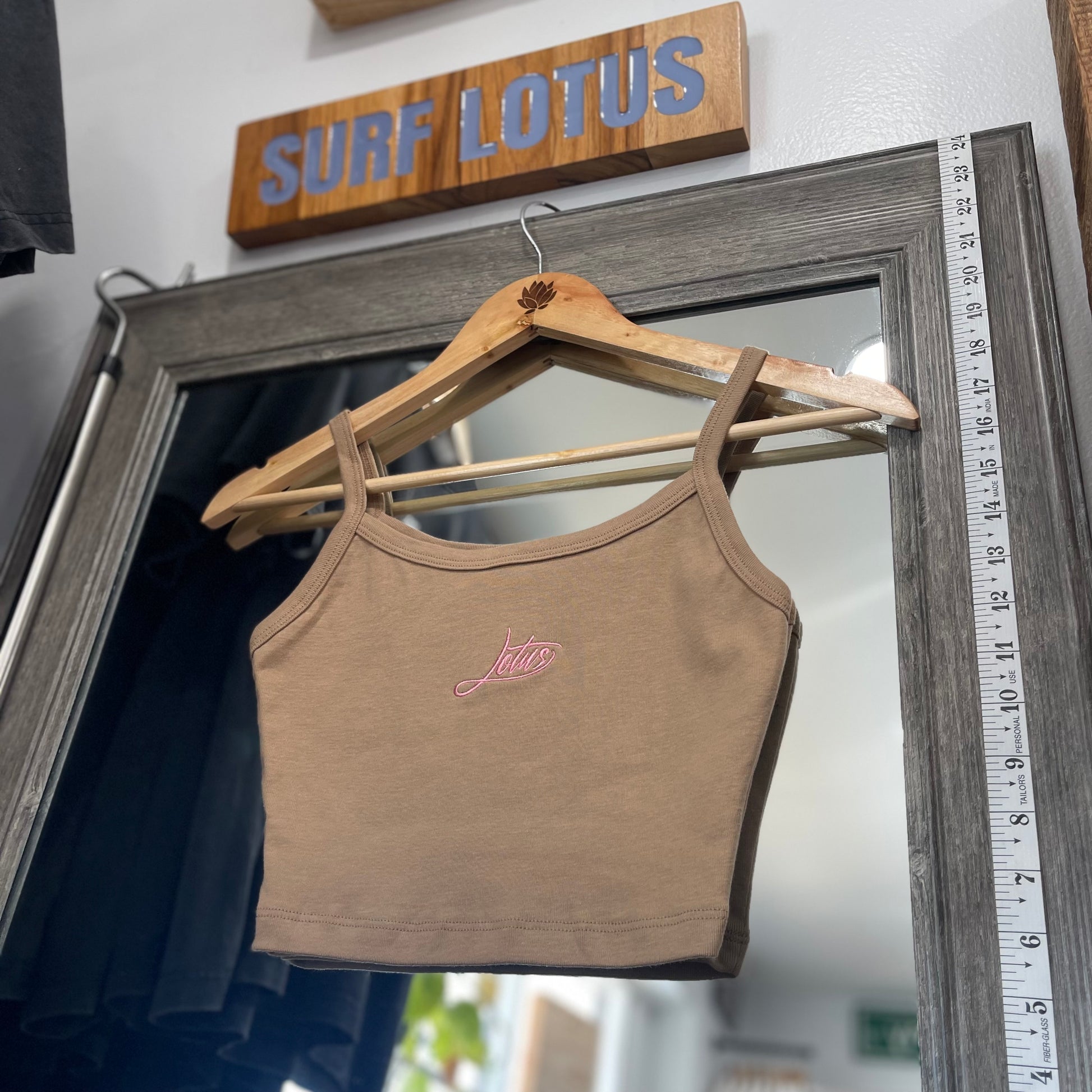 The Lotus embroidered baby rib spaghetti strap cropped tank is made of soft 30 singles yarn and stretches up to 2 times its original size. The 100% cotton tank shrinks 7% in the wash, but has been designed to fit before and after washing. The tank features an embroidered pink LOTUS Script center chest, and it is made in the USA