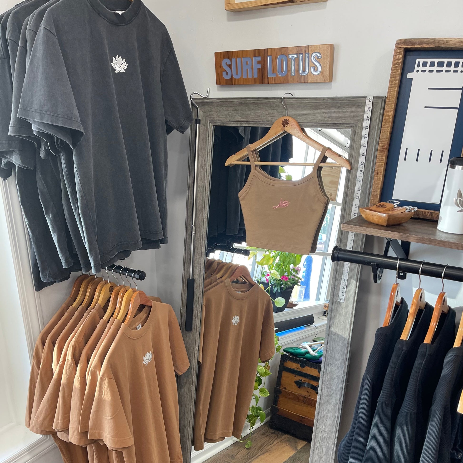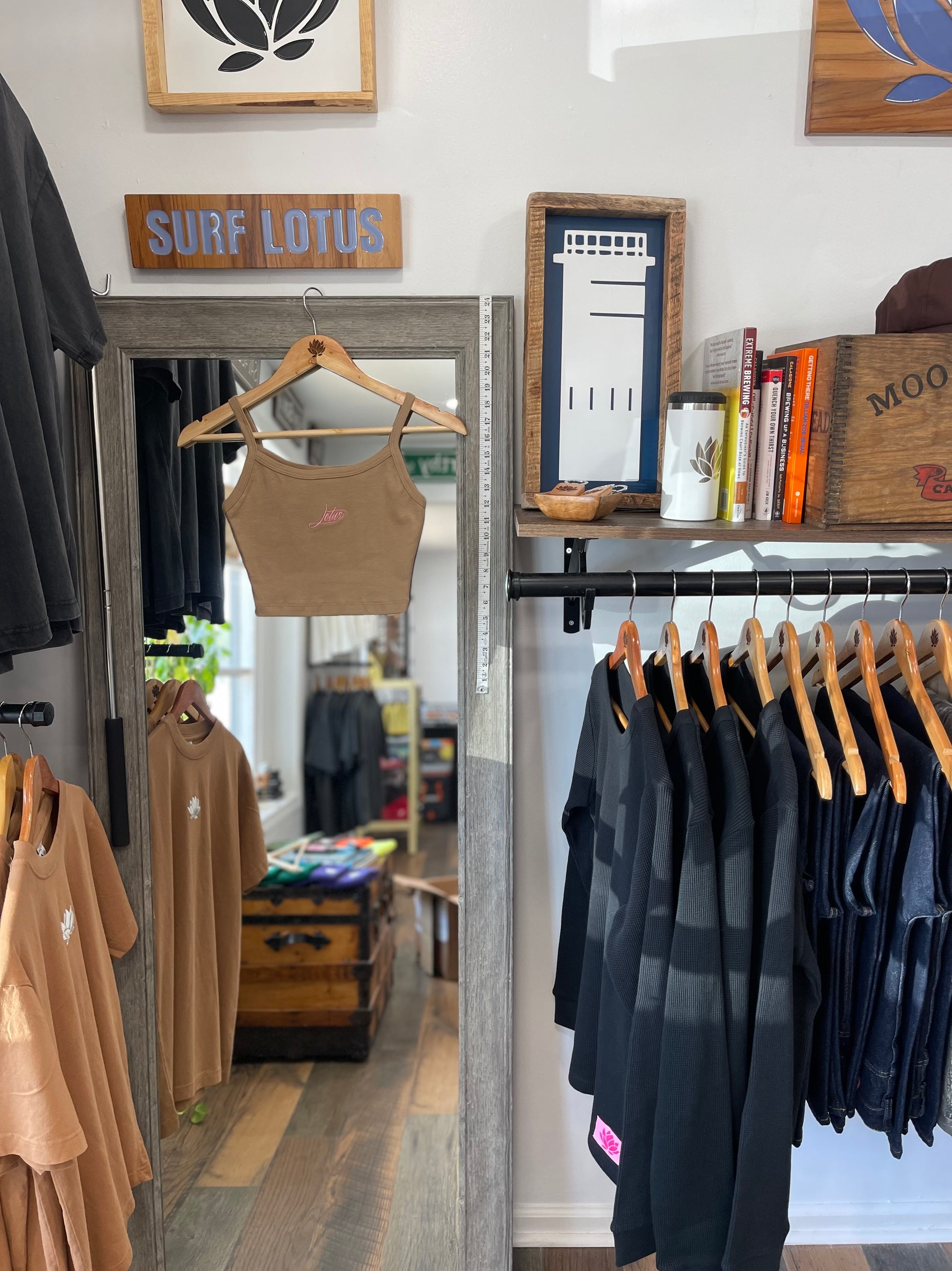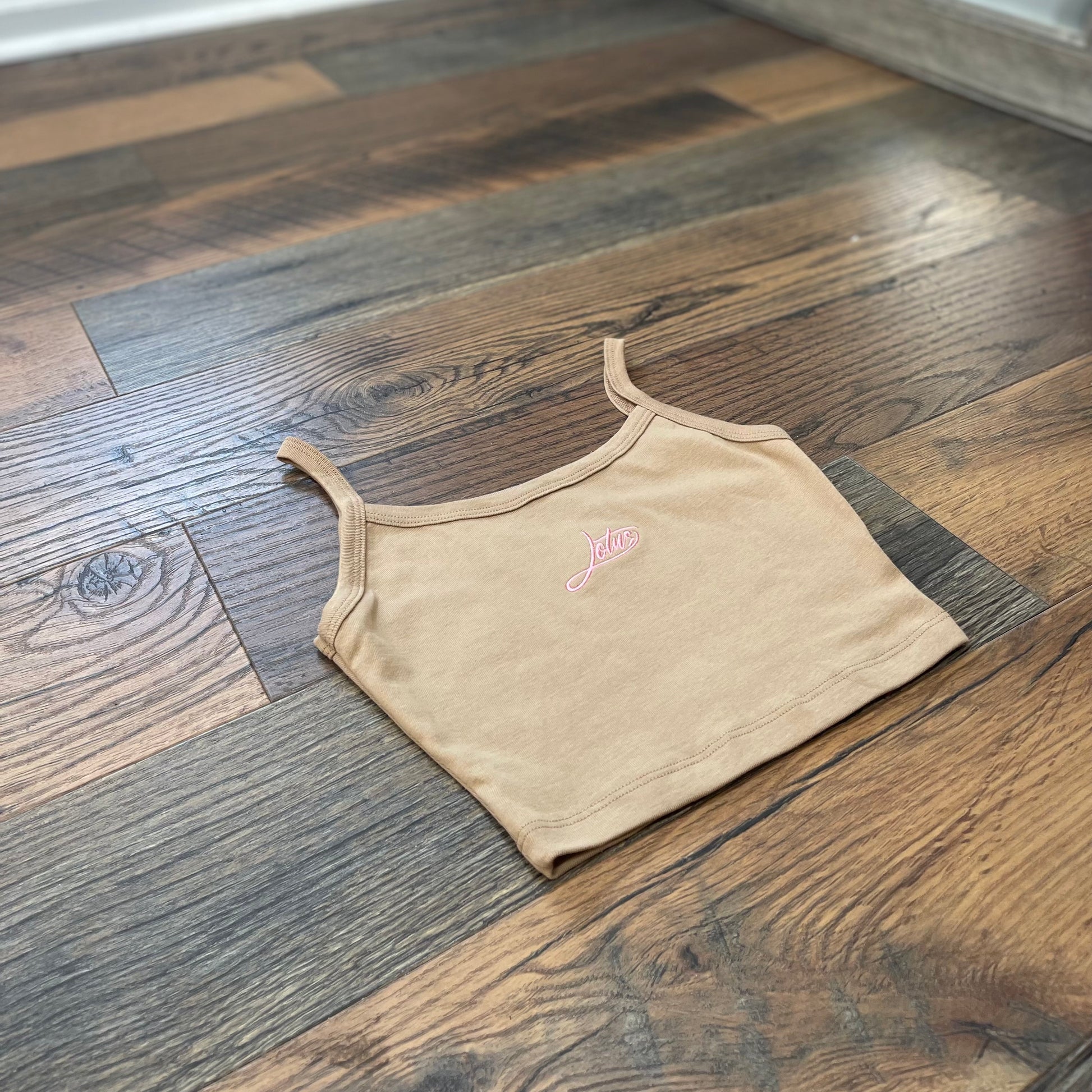 The Lotus embroidered baby rib spaghetti strap cropped tank is made of soft 30 singles yarn and stretches up to 2 times its original size. The 100% cotton tank shrinks 7% in the wash, but has been designed to fit before and after washing. The tank features an embroidered pink LOTUS Script center chest, and it is made in the USA