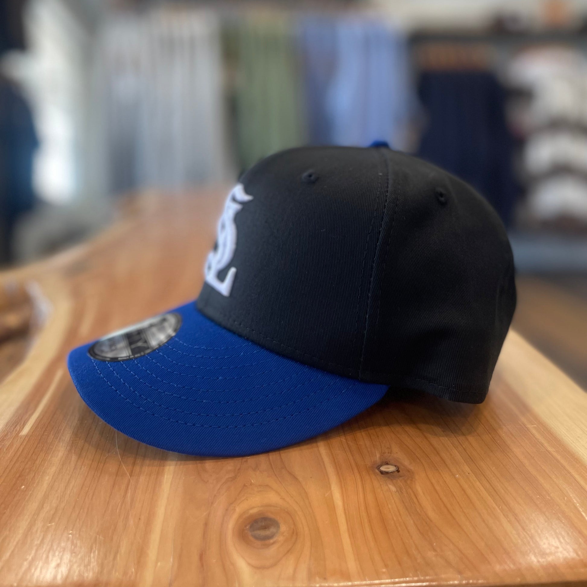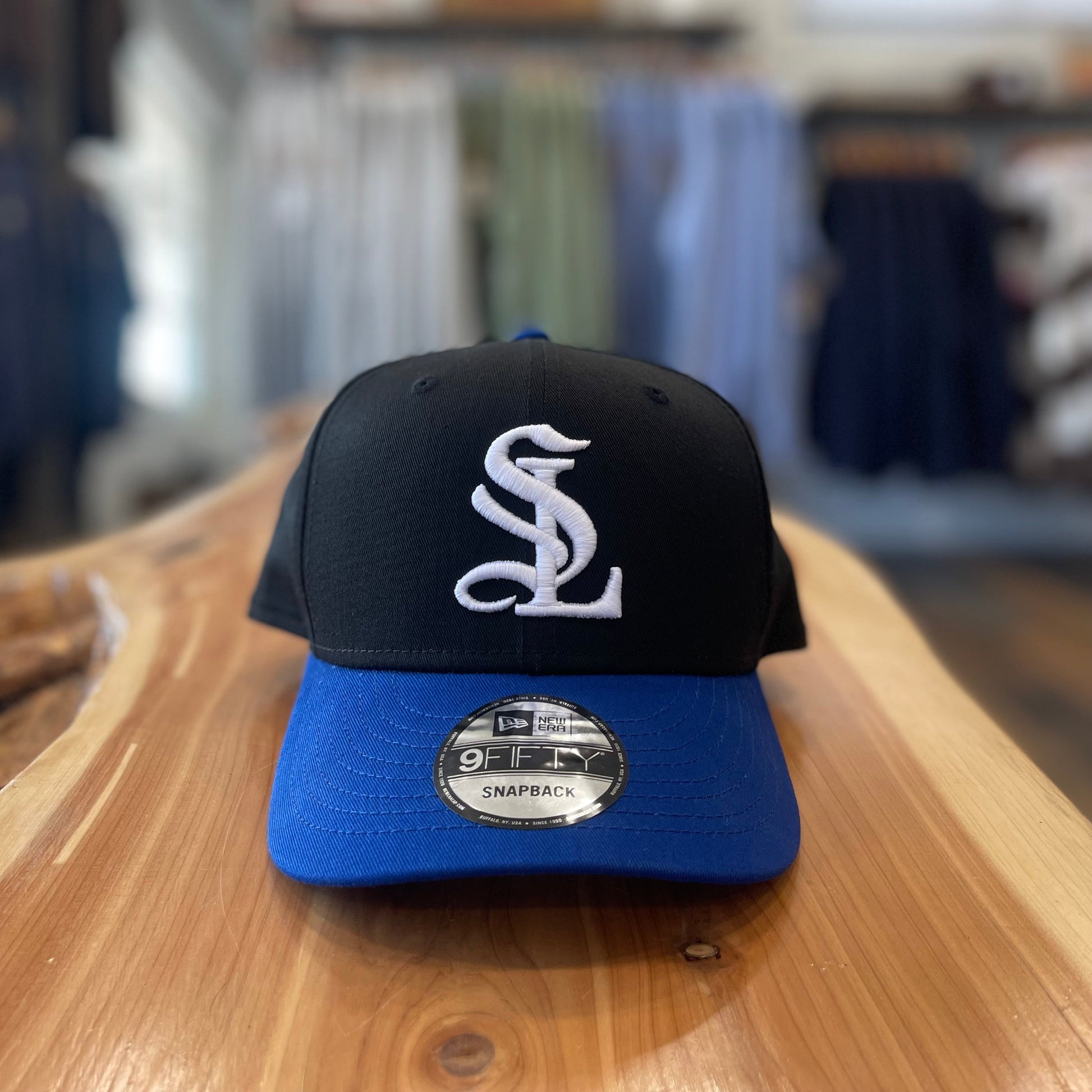 New Era 9FIFTY has an urban attitude thanks to the iconic flat bill and old-school snapback closure. Monogram embroidered front with white SL logo. Color is Royal and Black