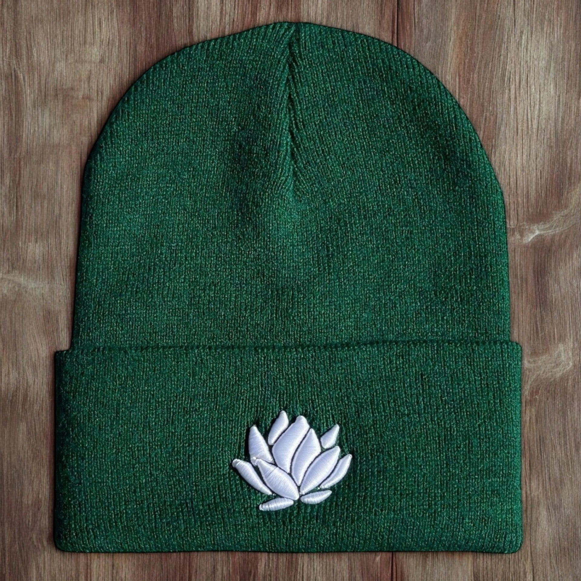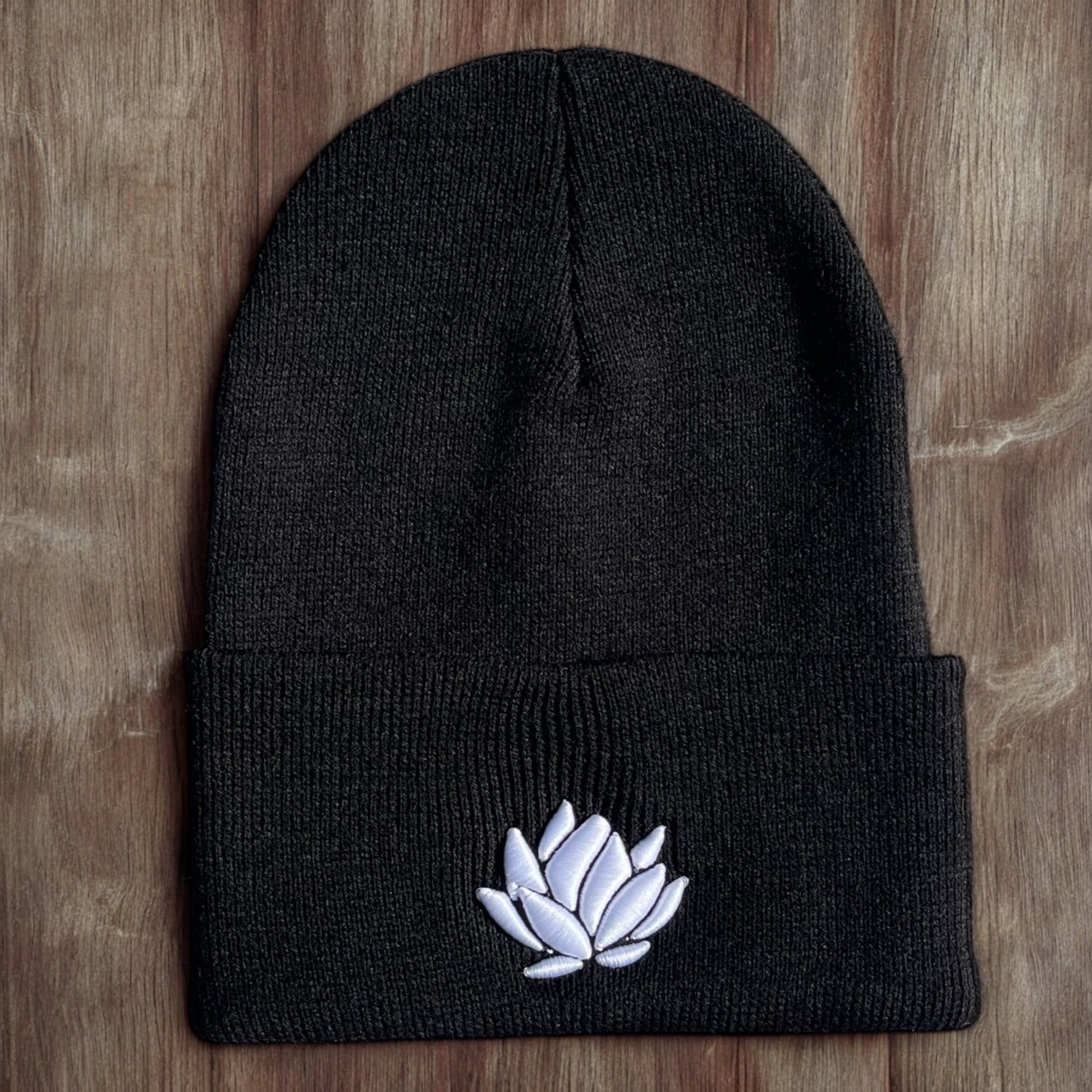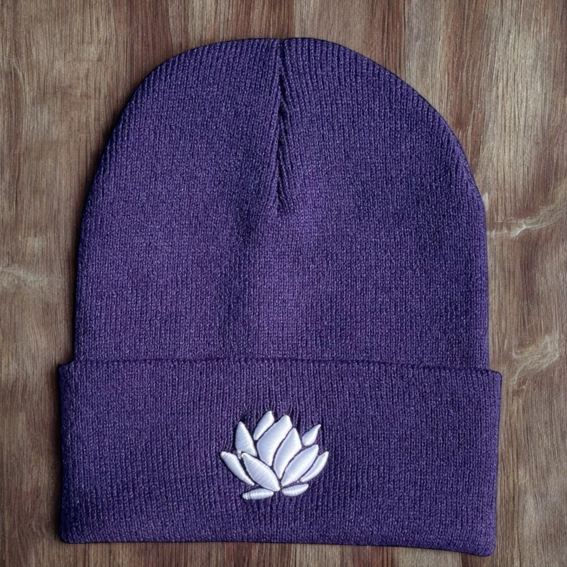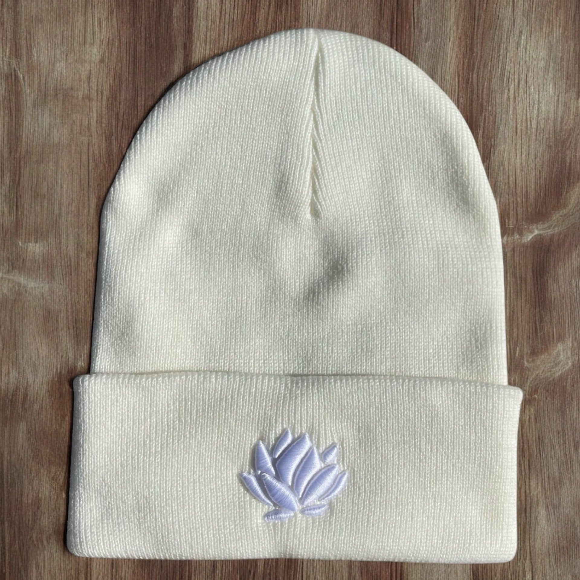 The Surf Lotus Classic Cuff Beanie is made in the USA. Offered in twelve colors. NEW puff lotus embroidery in white.