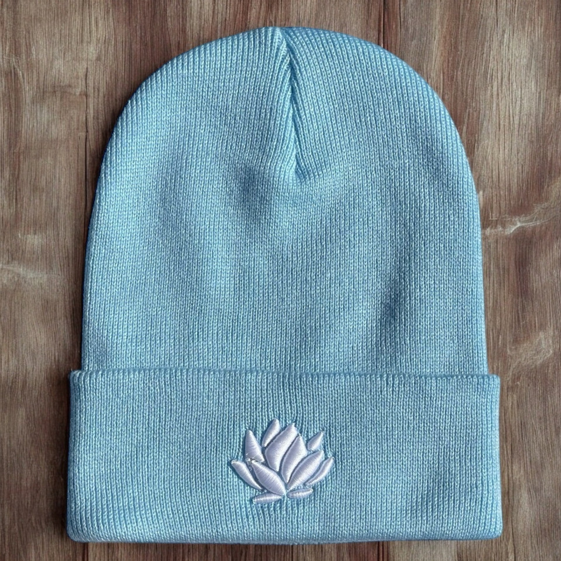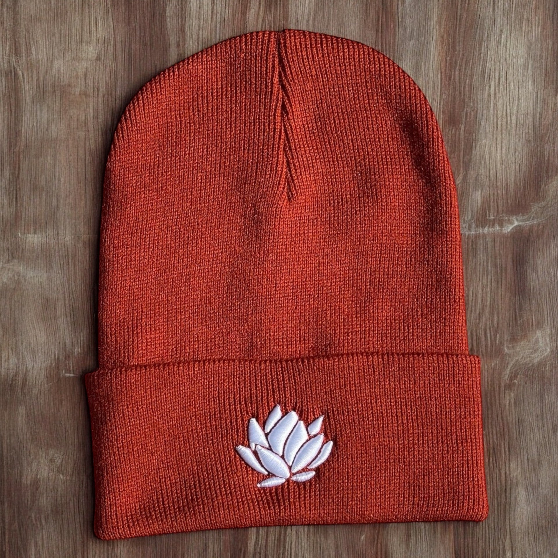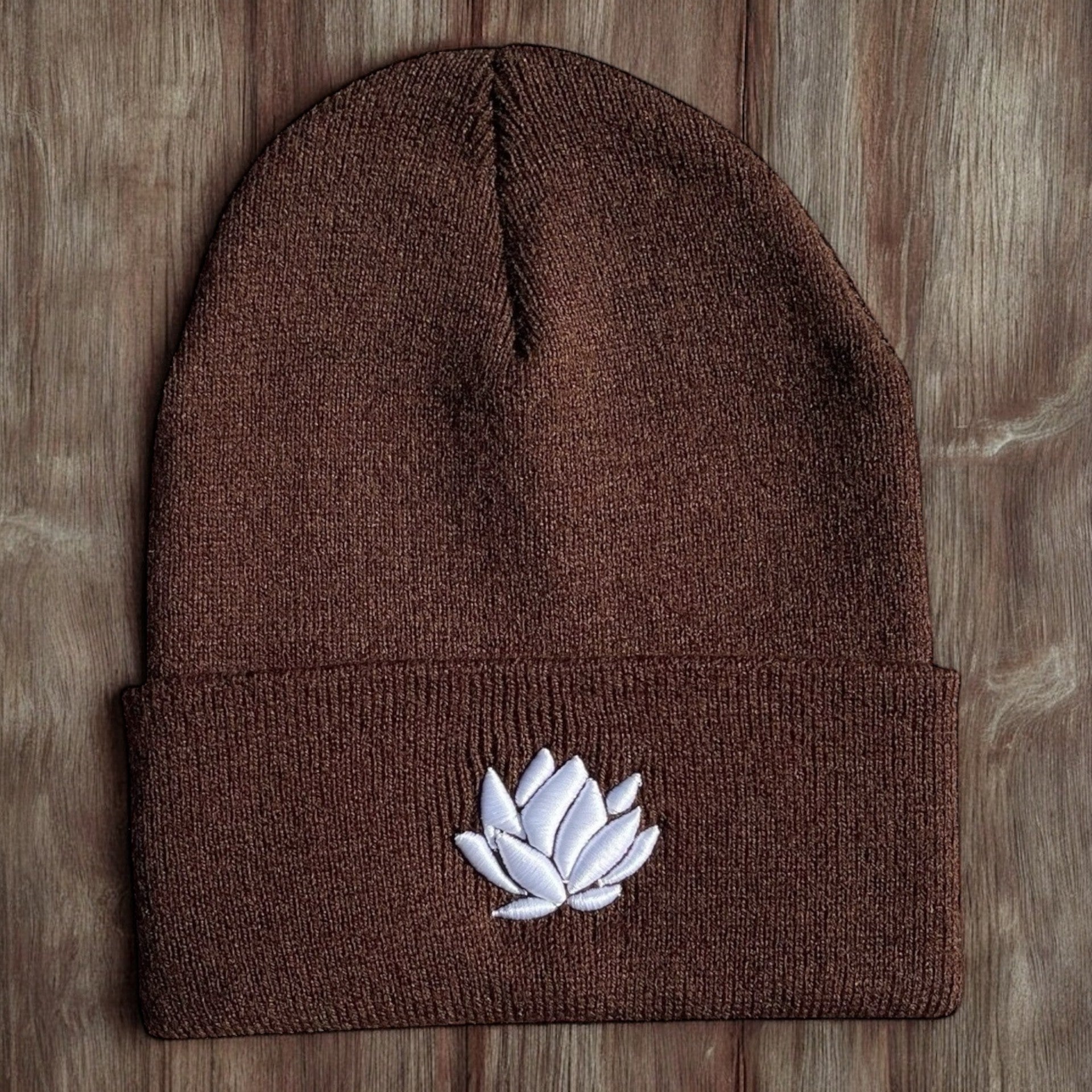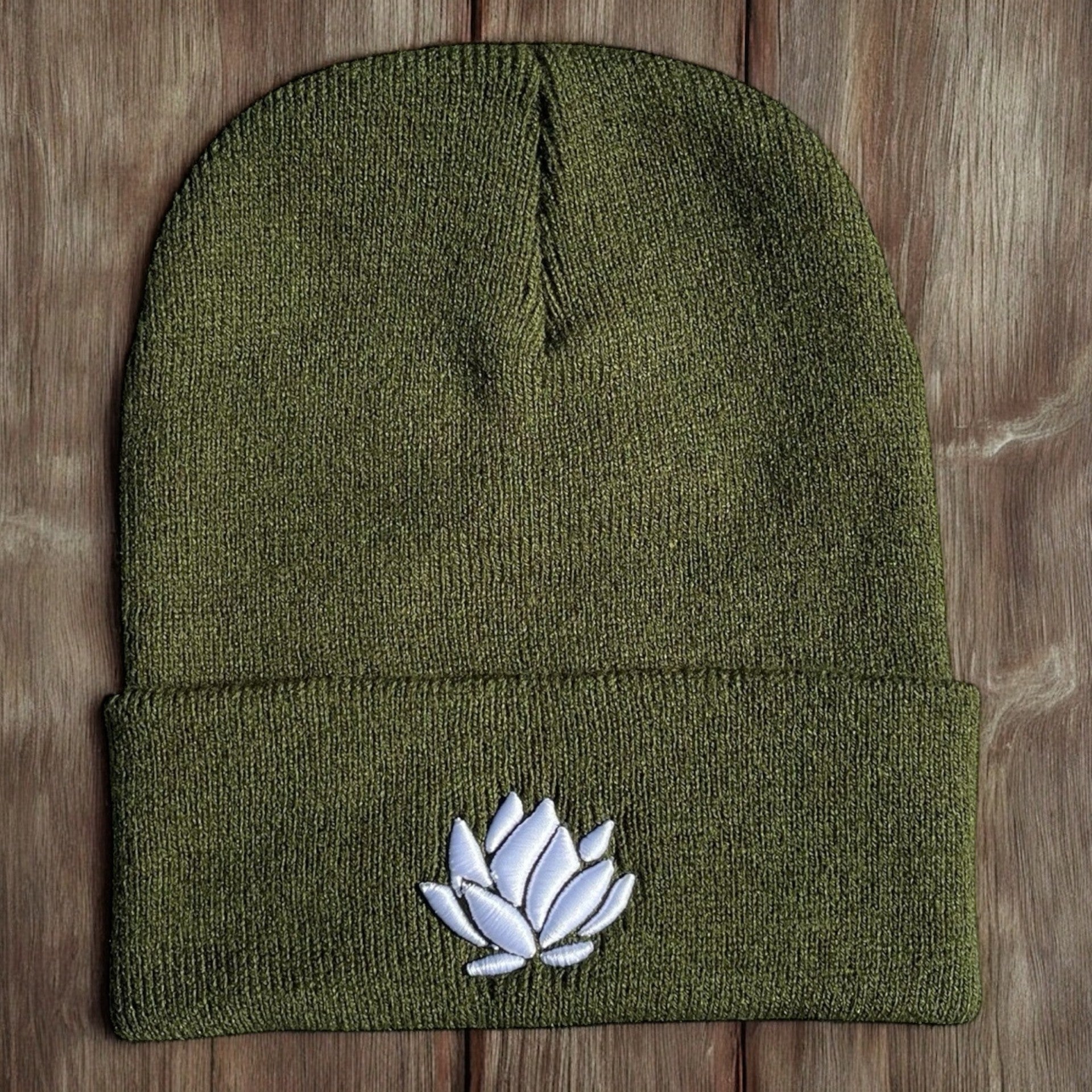 The Surf Lotus Classic Cuff Beanie is made in the USA. Offered in twelve colors. NEW puff lotus embroidery in white.