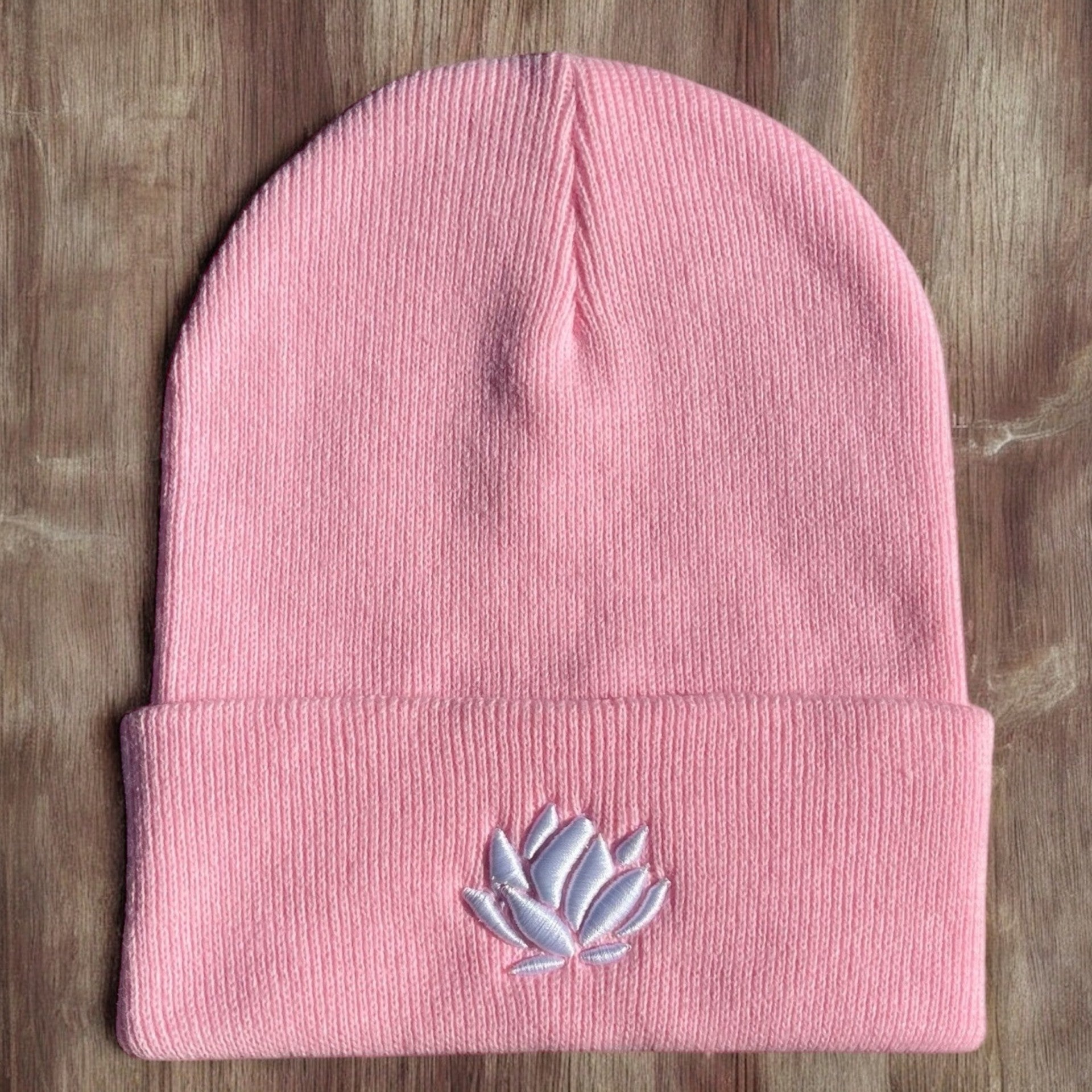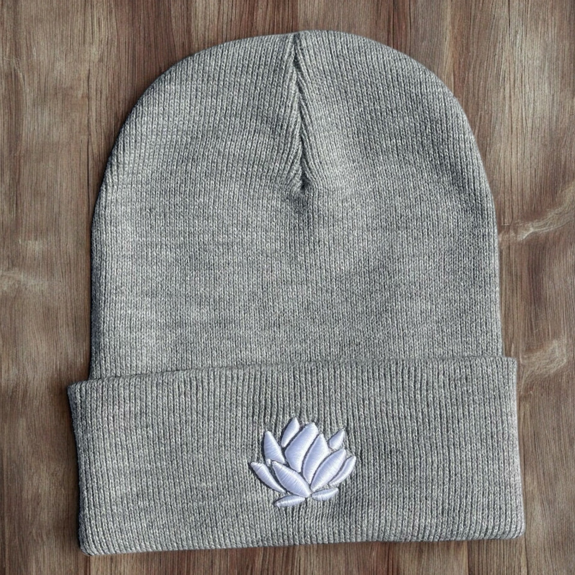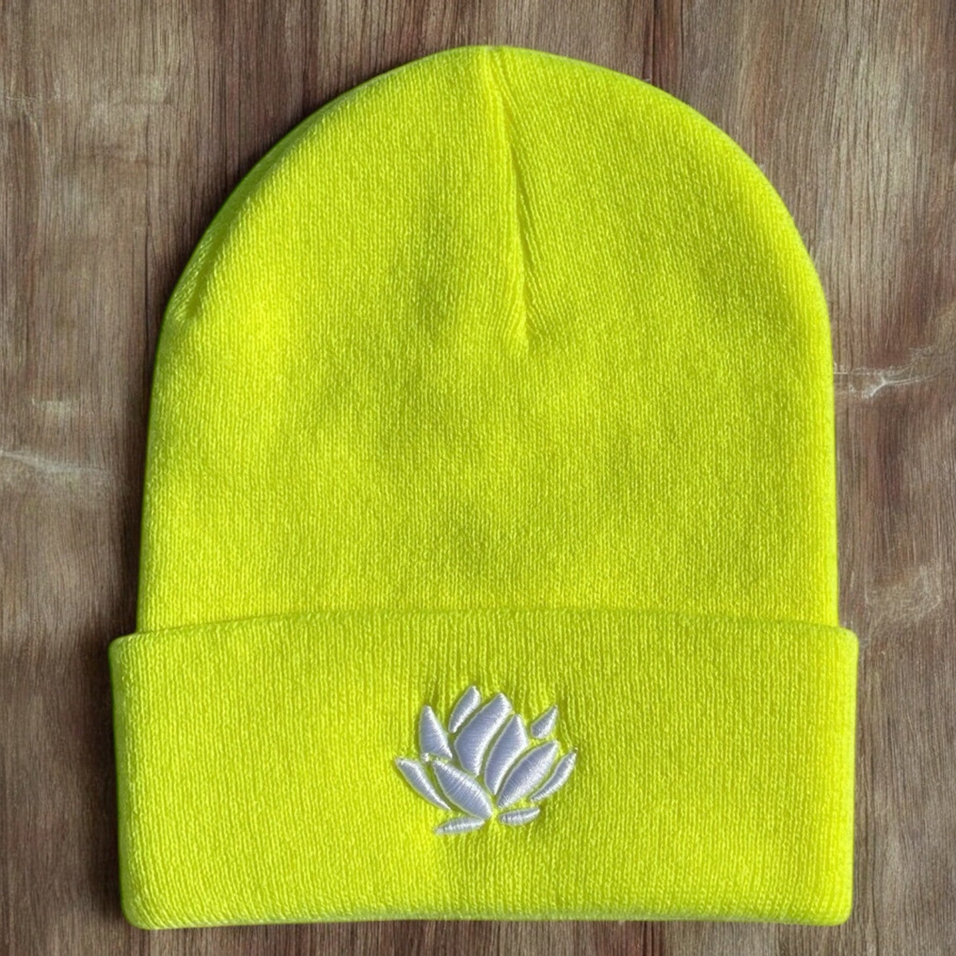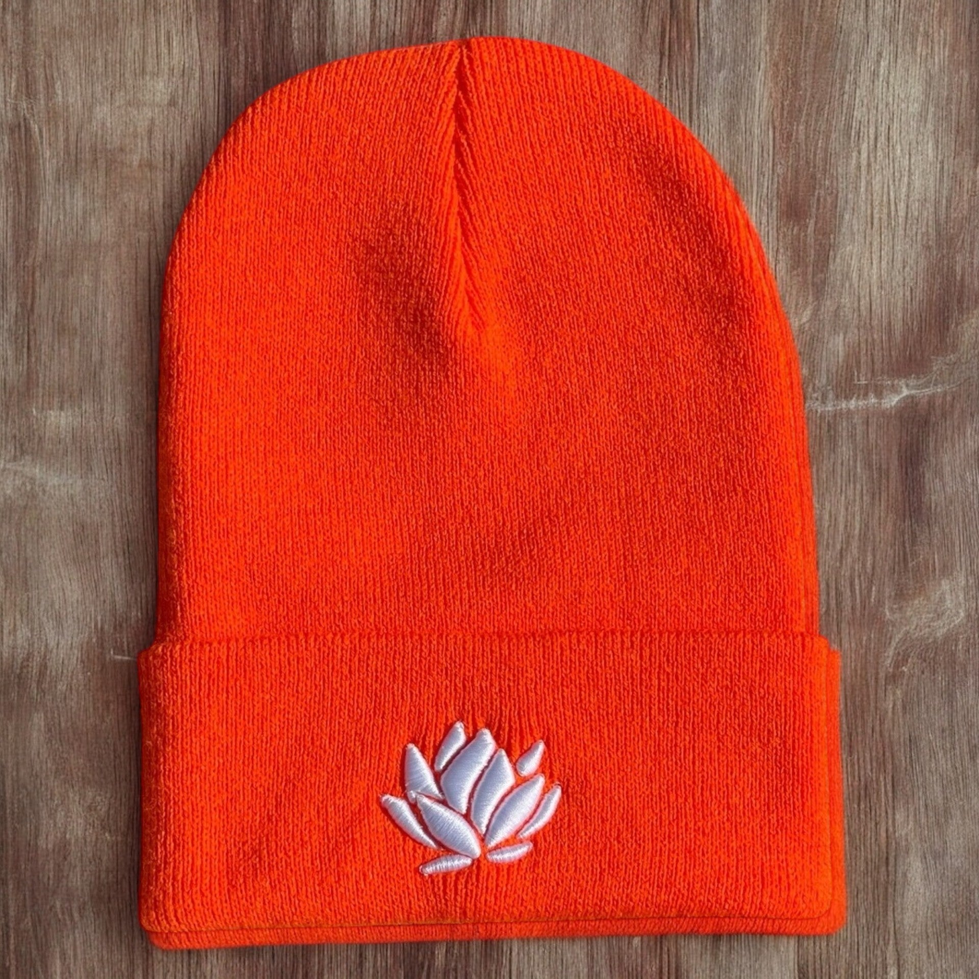 The Surf Lotus Classic Cuff Beanie is made in the USA. Offered in twelve colors. NEW puff lotus embroidery in white.