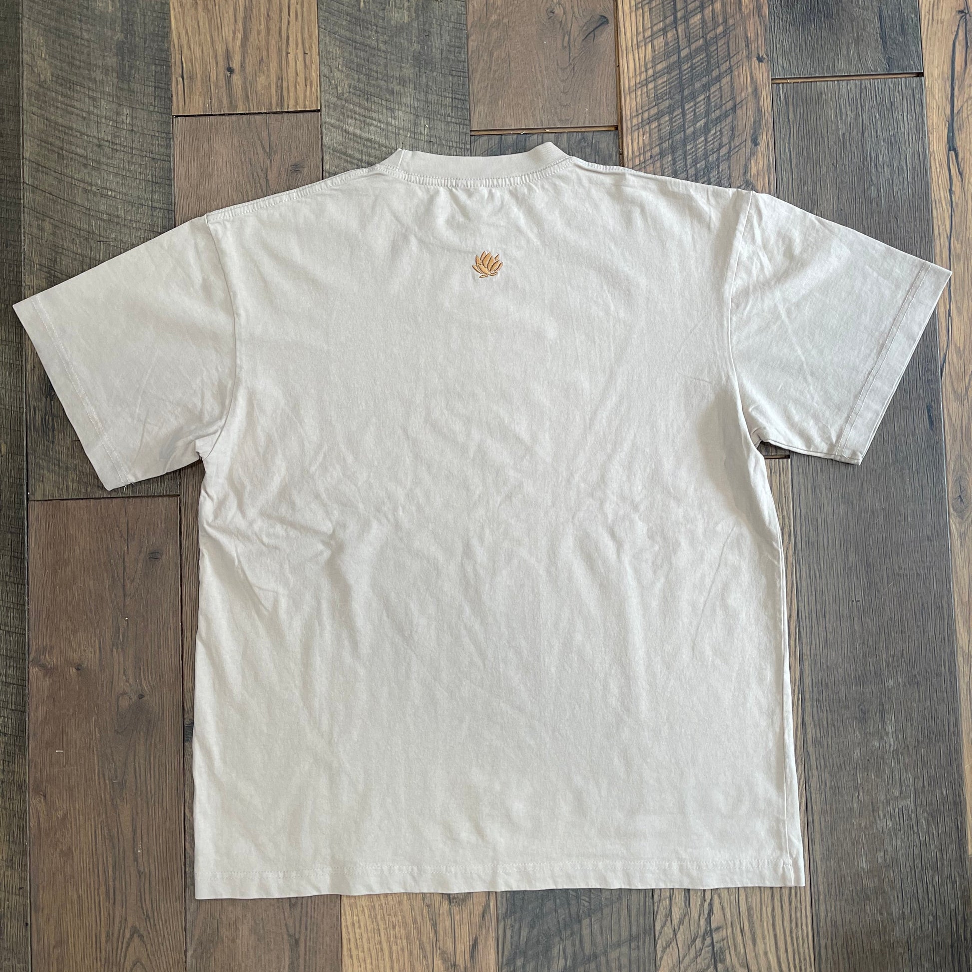 The 7.5oz combed cotton is a flowy-breathable fabric perfect for the hotter summer days ahead. All of these shirts have a specific enzyme wash which allows the vintage aesthetic and fades beautifully wear after wear. Color is Tan with a subtle light brown lotus on the back.